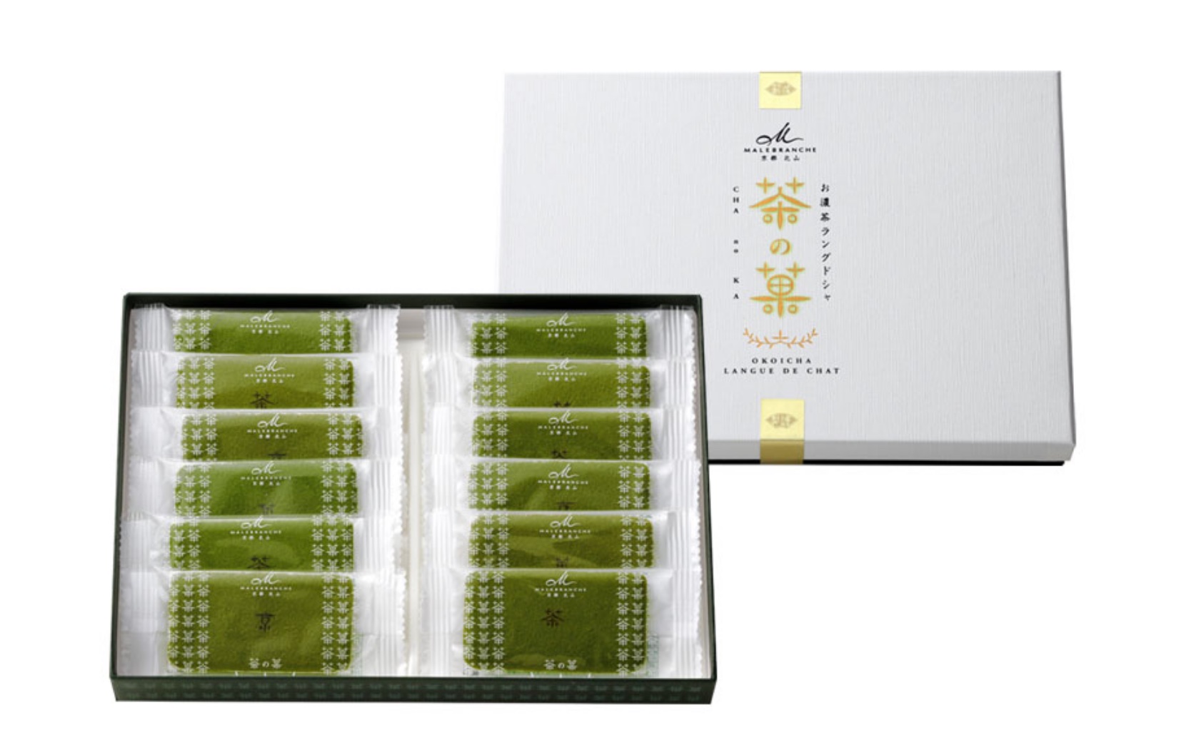 こだわりお濃茶たっぷりのラングドシャ「茶の菓」。お濃茶のほろ苦い香りとお抹茶本来の甘みが感じられるラングドシャと、たっぷりのホワイトチョコレートが、お口の中で溶けていきます。